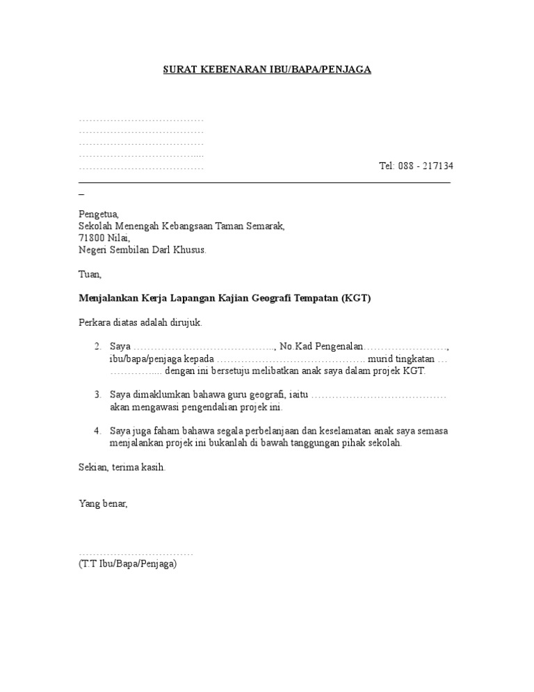 Contoh format surat kebenaran ibu bapapenjaga. SEKOLAH MENENGAH KEBANGSAAN DURIAN DAUN MELAKA LORONG TUN FATIMAH. Surat Akuan Kebenaran Ibu Bapapenjaga Menyertai Aktiviti Kokurikulum.