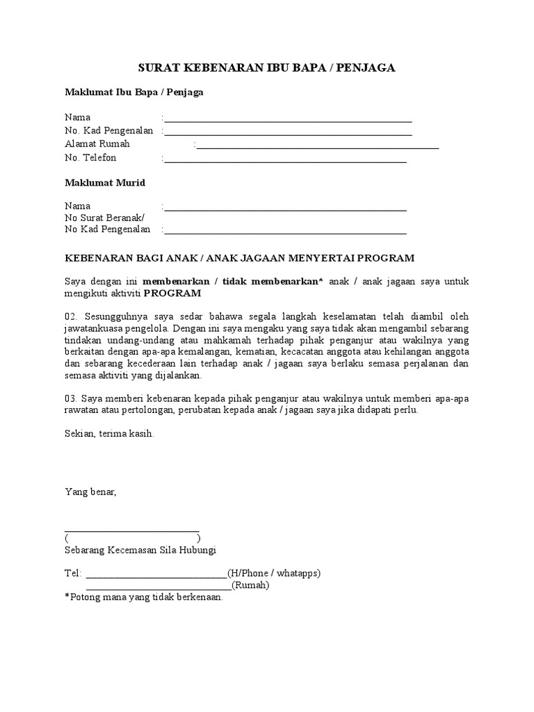 Contoh surat kebenaran ibu bapa 1. Saya dengan ini memberi kebenaran bertulis saya kepada anak jagaan saya untuk menyertai. SURAT AKUAN DAN KEBENARAN IBU BAPA PENJAGA Kepada.